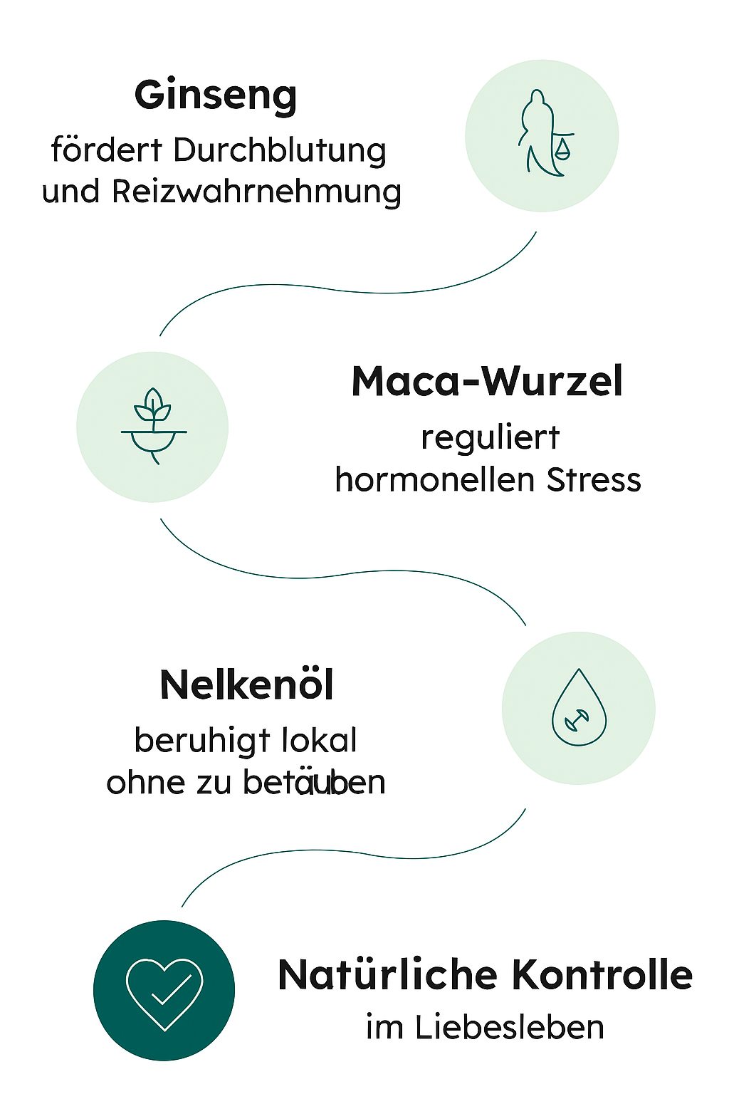 Maca, Ginseng und Nelkenöl – 100 % natürlich, genau in der richtigen Menge und in geprüfter Qualität.